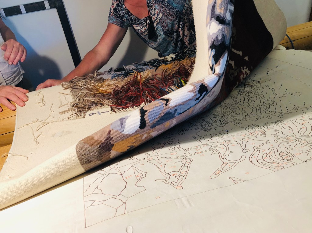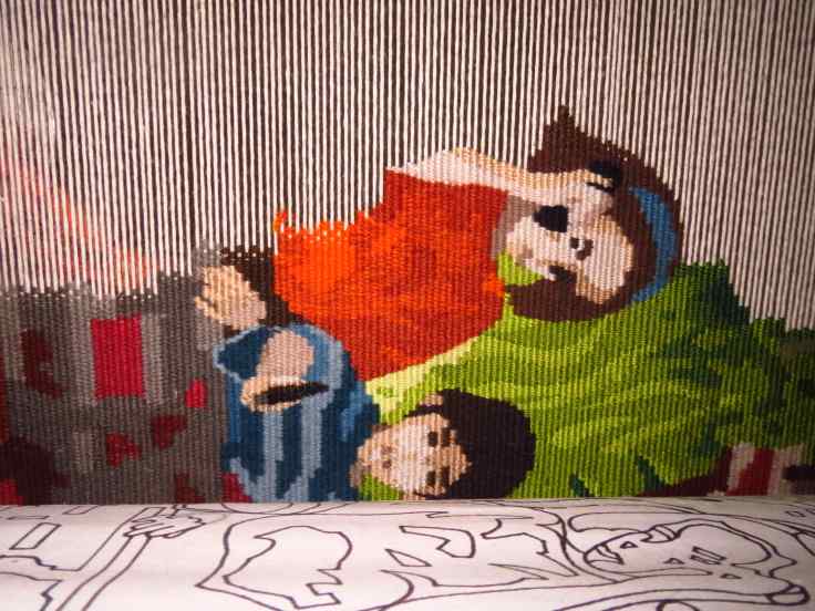 Cette tapisserie est tissée sur l’envers, à l’aide de ces différentes flûtes de laine, guidée par le carton glissé sous la chaîne et d’un petit miroir que l’on peut glisser entre la chaîne et le carton ce qui permet de vérifier le dessin sur l’endroit avant d’enrouler le tissage sur le rouleau avant et de continuer le travail.