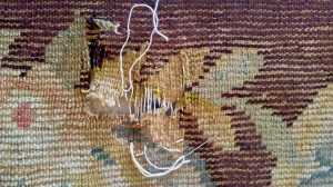 Après le rentrayage du fil de chaîne et le retissage de la trame à l’aide d’un fil de chanvre teinté à l’identique, le retissage des points noués en laine peut s’effectuer avec auparavant une recherche du dessin manquant et des couleurs correspondantes.