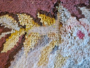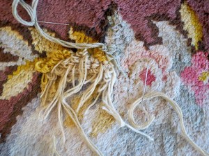 Différentes étapes de restauration d’une des déchirures de ce tapis due à la fragilité de la trame de chanvre.
