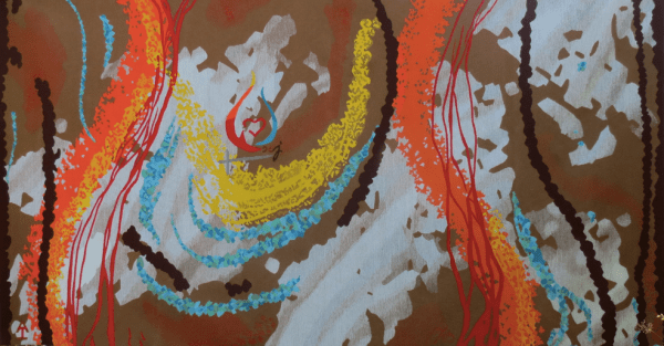 Tapisserie en cours de réalisation Cette tapisserie est tissée sur l'envers, à l'aide de ces différentes flûtes de laine, guidée par le carton glissé sous la chaîne et d'un petit miroir que l'on peut glisser entre la chaîne et le carton ce qui permet de vérifier le dessin sur l'endroit avant d'enrouler le tissage sur... Lire la Suite →